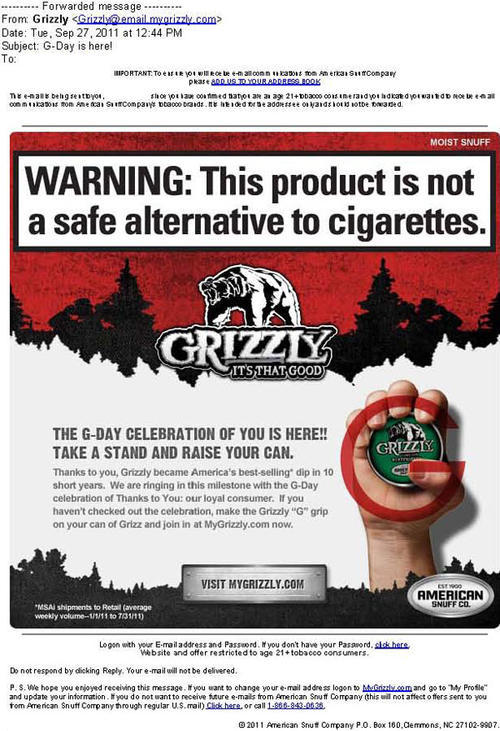 Email sent in late September 2011 in celebration of Grizzly's 10 year anniversary, a milestone marked as "G-Day". "Thanks to you, Grizzly became America's best-selling dip in 10 short years."
