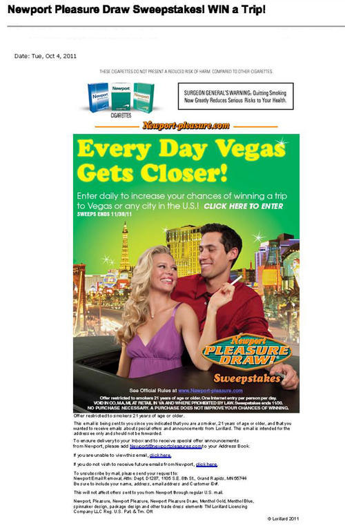 Email received from Newport in October 2011 promoting a new blackjack themed sweepstakes - the 2011 Newport Pleasure Draw. Users can play rounds of blackjack daily during the promotional period for a chance to win a trip to Las Vegas or any city in the US.
