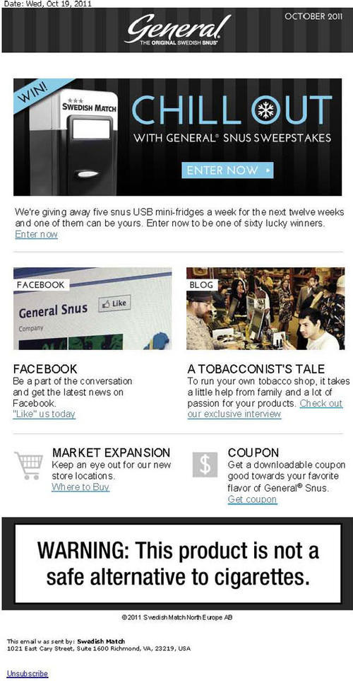 Email from General Snus received in October 2011 in promotion of the Chill Out sweepstakes, which features snus USB mini-fridges as prizes. The e-mail also advertises the brand's profile page on Facebook.