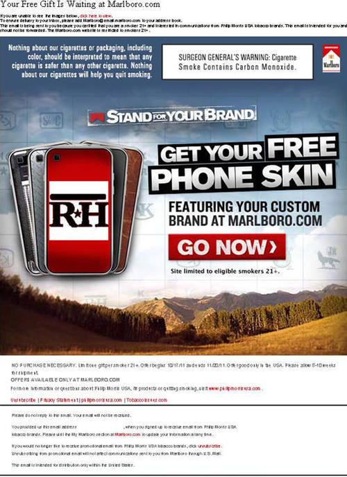 Email from Marlboro received in November 2011 advertising the "Stand for Your Brand" promotion, which allows smokers to customize and brand a free protective skin for a phone, camera or MP3 player.