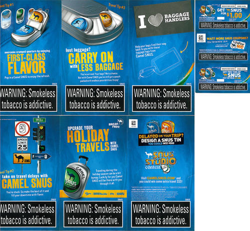 Holiday and travel themed Camel Snus mailing received in December 2011. The mailing encourages receivers to "upgrade your holiday travels with Camel Snus". Two snus coupons are included.