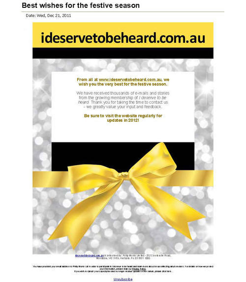 Email sent in December 2011 sending holiday greetings and wishes and thanking receivers for visiting and participating in IDeservetobeheard.com.au