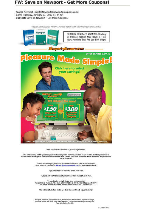 Newport email sent in January 2012 announcing a new coupon offer available from the brand's website. Visitors to the site can choose to redeem two coupons for $1.50 off a pack, or one coupon for $3.00 off two packs or one carton.