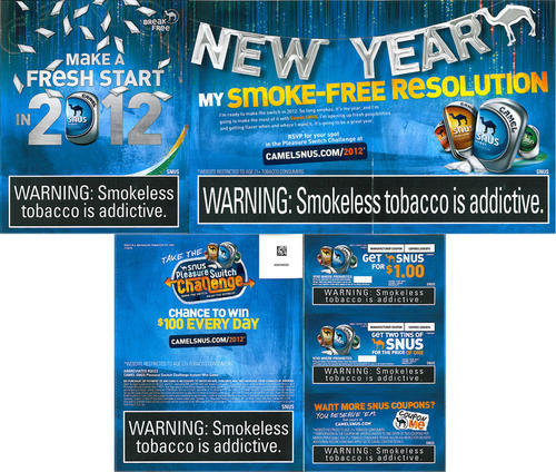 New Year's holiday themed direct mail received in late December 2011 suggesting smokers "make a fresh start in 2012" by switching to Camel Snus, to fulfill a "smoke-free resolution". The mailing directs smokers to the brand's website to participate in the "Pleasure Switch Challenge". Two coupons for Camel Snus are also included.