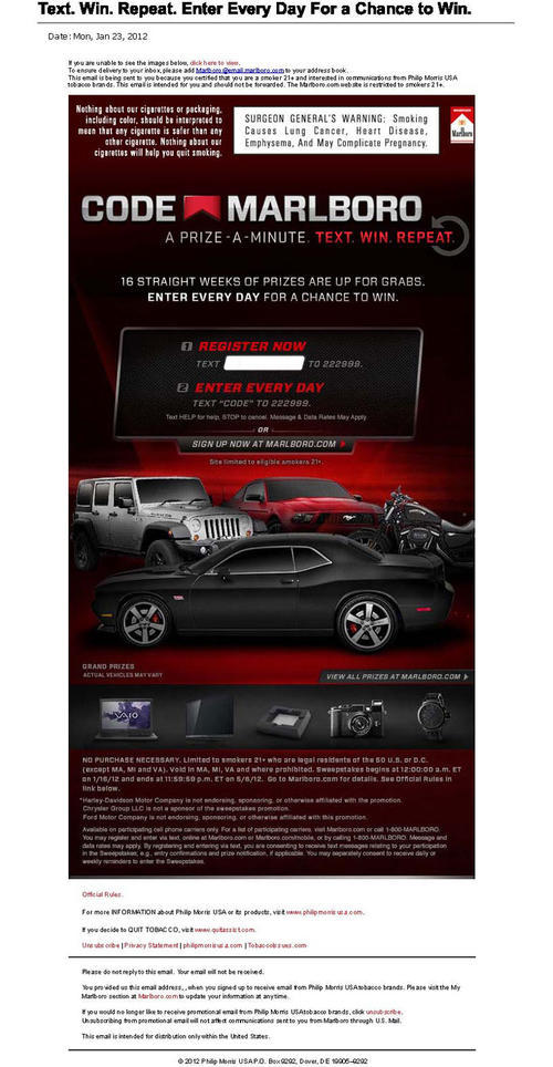 Marlboro email received in January 2012 in promotion of a new sweepstakes called Code Marlboro. Participants can enter once a day (by sending a text message through their cell phone, by calling a 1-800 phone number or through Marlboro.com) for a chance to win a daily prize (including watches, electronics and other gadgets) or a period end grand prize (a car, motorcycle or cash equivalents). The promotion runs through May 6, 2012, and consists of 4 periods, each with its own grand prize offering.