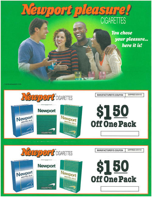Direct mailing received from Newport in January 2012 providing coupons based on a coupon offer posted on the brand's website in January 2012. Text: "You chose your pleasure...here it is!"