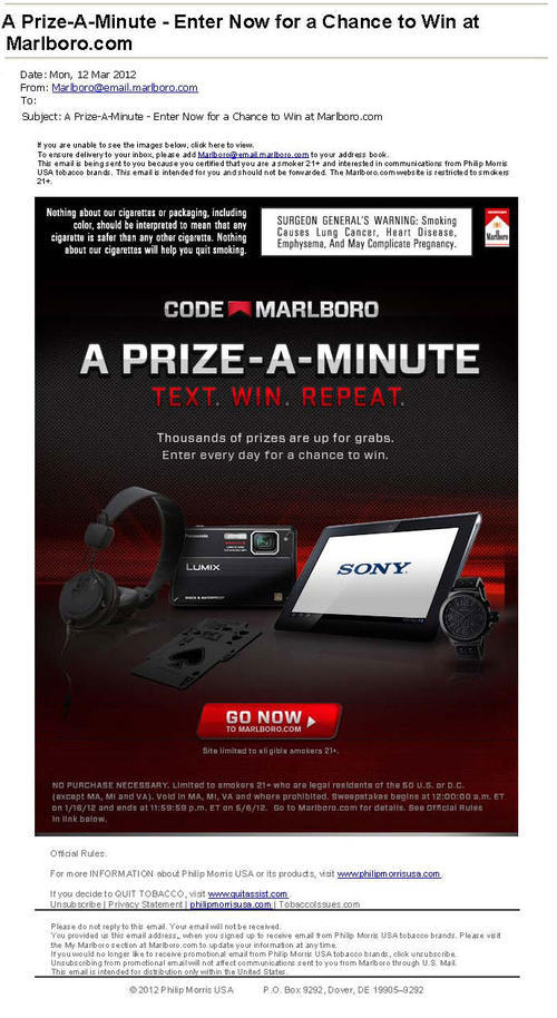 Marlboro email received in March 2012 reminding the receiver about the Code Marlboro sweepstakes. Participants can enter once a day (by sending a text message through their cell phone, by calling a 1-800 phone number or through Marlboro.com) for a chance to win a daily prize (including boots, electronics and other gadgets) or a period end grand prize (a car, motorcycle or cash equivalents). The promotion runs through May 6, 2012, and consists of 4 periods, each with its own grand prize offering.