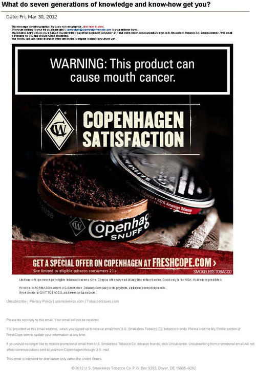 Copenhagen email sent in March 2012 inviting the receiver to "get a special offer on Copenhagen" from the brand's website. "Copenhagen Satisfaction"