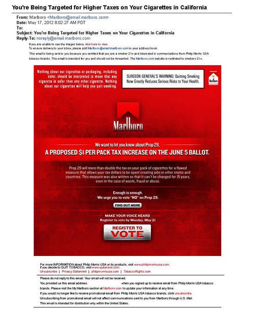 Marlboro email sent in May 2012 to California smokers urging them to vote “no” for Proposition 29 during California’s primary election ballot on June 5th. Prop29 would increase the cigarette tax by $1.00 per pack and impose an equivalent tax increase on other tobacco products. While the tax revenues would fund research for cancer and tobacco-related diseases, the email warns smokers that tax dollars would be spent on “creating job in other states and countries”.
