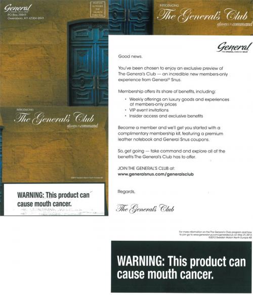 Direct mail received in June 2012 inviting the receiver to join the "exclusive" General's Club. The envelope and the mailing were made to look like an event invitation. Joining the club will include membership benefits such as: weekly offerings on goods and experiences at discounted prices, VIP event invitations and insider access. A complimentary membership kit, containing a leather notebook and coupons, is offered to the receiver upon becoming a member.