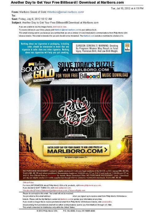 Email from Marlboro received in July 2012 promoting the new music themed Sound of Gold Sweepstakes. Participants are allowed to enter daily for prizes such as concert packages and other music themed items. Upon entry, participants are given the opportunity to solve a Marlboro themed puzzle to win a free Billboard song download.