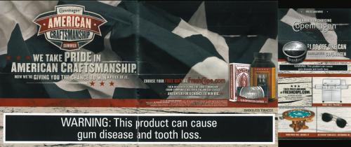 Copenhagen mailing received in in July 2012 offering the receiver the choice of one of the following free gifts: playing cards, barbeque sauce or $10 in Copenhagen coupons. The receiver is directed to the brand website in order to redeem the offer. The mailing also promotes the Copenhagen American Craftsmanship Sweepstakes where participants can select one prize to be entered for. Prizes include: a wood poker table; a canoe; grills, flags, flashlights, skillets, and others, each with its own odds for winning. .