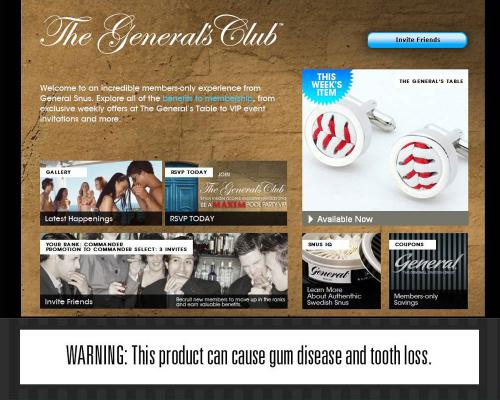Page from General Snus' brand website (www.generalsnus.com) recorded in July 2012 depicting the "exclusive" General's Club portion of the site. The General's Club provides members with lifestyle content about and weekly offers for luxury goods. The gallery contains pictures from recent Maxim pool parties which included General's Club VIP areas, as well as General Snus sampling events. Members begin at the Commander rank, upon "recruiting" three people to join the General's Club, they are advanced to the Commander Select rank and are awarded a one year Pandora One membership. If the member "recruits" twelve people, they are advanced to the Commander Elite rank and are awarded with insider access to General Snus products and operations, one year Hulu Plus Membership and advance notice of special events and offers, as well as all the benefits of the lower "ranks".