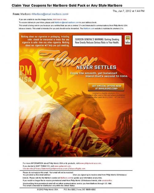 (formerly known as Marlboro Lights). The e-mail also advertises special offers available from the brand's website.Text: Flavor never settles. Enjoy the smooth, yet balanced blend that's second to none."