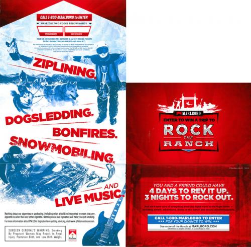 Marlboro mailing in promotion of the Marlboro Rock the Ranch Sweepstakes, which took place between October 12 -November 4, 2011. The receiver is prompted to call 1-800-Marlboro and provide 2 codes which are included in the mailing. One entry is allowed per person for the sweepstakes period. The prize was a trip 4 day/ 3 night trip for two to a ranch in Montana. The images are of people enjoying winter activities such as ziplining and dog sledding. Text: \"Enter to win a trip to Rock the Ranch. Ziplining. Dogsledding. Bonfires. Snowmobiling. And live music.\" The receiver is also directed to the brand website for more information.