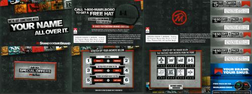 Marlboro mailing containing an offer for a free hat under the Stand for Your Brand promotion. To get the free hat, the receiver had to choose one of the logos by scratching the box next to the answer of three questions: 1) Are you Male or Female; 2) Do you feel at home in the Country or City; 3) Come Saturday, do you head out or lay low. Once the boxes next to the correct responses were scratched off, the receiver was left with a three digit number which corresponded to a logo designed by Marlboro, based on the receiver\'s initials. The receiver then had to call 1-800-Marlboro to redeem the offer. The mailing also contained multiple coupons: 3 coupons for $1.50 off one pack; 1 coupon for $5.00 off 4 packs or one carton; and 1 coupon for a free pack or tin of Marlboro Snus with the purchase of another Marlboro product. Main Text: \"We\'ve got something with your name all over it.\" Receivers were also directed to the brand website to further explore the Stand for Your Brand promotion.