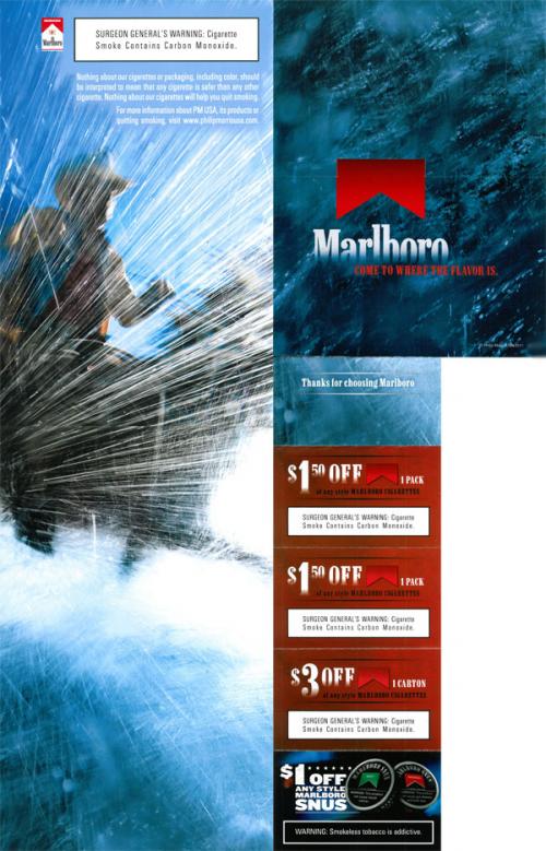 Marlboro mailing received by Trinkets & Trash in May 2012. The image features a cowboy on a horse riding through what appears to be water. The splashes made by the horse obscure the image of the rider so it is not clear. The mailing contained 4 coupons: 2 coupons for $1.50 off 1 pack; 1 coupon for $3.00 off one carton; and 1 coupon for $1.00 off any Marlboro Snus. Text: "Marlboro. Come to where the flavor is."