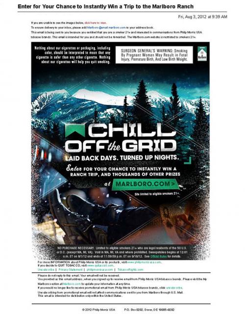 Email from Marlboro received in August 2012 promoting the new winter themed Chill off the Grid Sweepstakes. The email directs the receiver to the Marlboro website to place an entry. Once at the website, you are asked to vote for one of two experiences so that the "ranch experience" (the grand prize is a 4 day/3 night trip for 2 to a ranch in the western United States) can be “customized” to member preferences. The vote also counts as a sweepstakes entry. Other prizes include speakers and lighters.