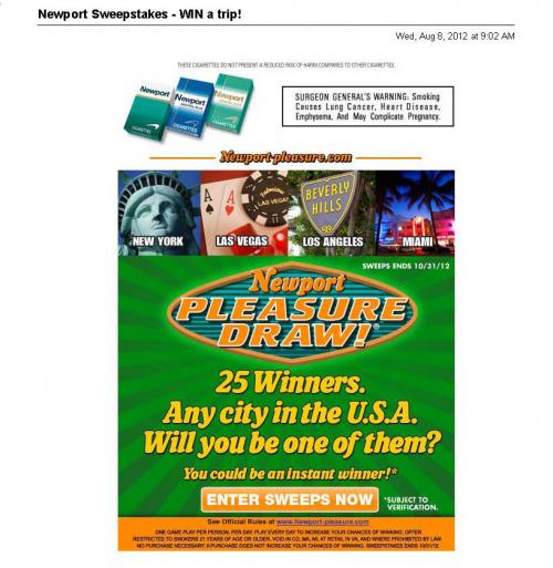 Email received in August 2012 from Newport, directing the receiver to visit the brand website in order to enter the Newport Pleasure Draw Sweepstakes. Once at the website, customers play a game of Black Jack, which serves as the sweepstakes entry, no matter who wins the game. Participants can enter the sweepstakes daily on the website. The grand prize is an all expense paid 3 night trip for 2 to any city in the United States plus $2,000 in spending money.