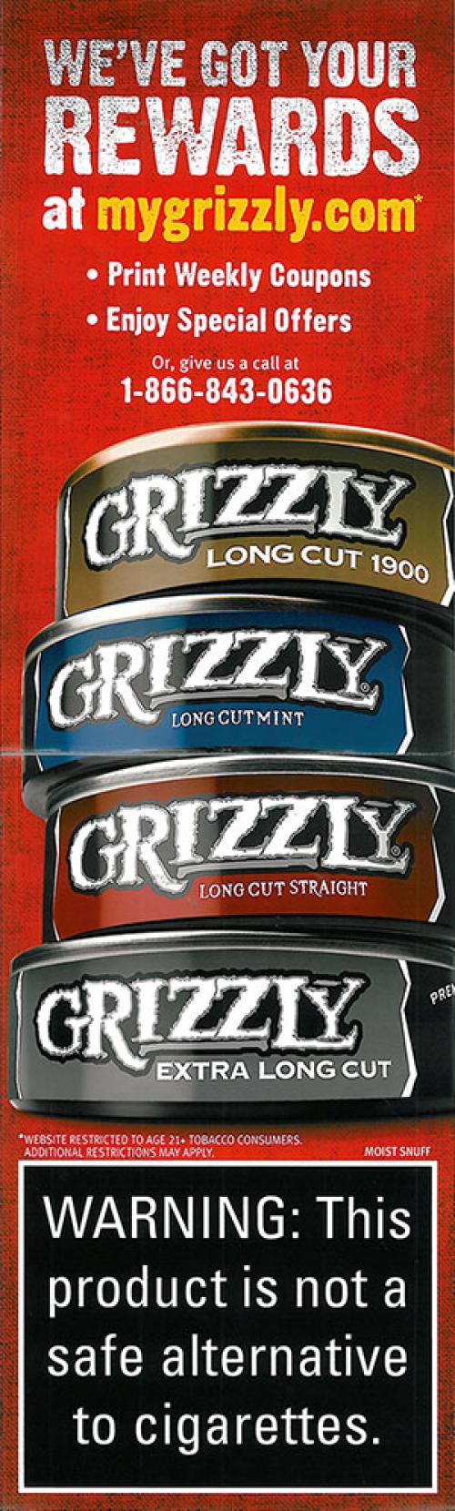 Direct mail received from Grizzly in August, 2012. The mailing directs the receiver to visit the brand website or call for coupons and other special offers. Two coupons were included, one coupon for $1.00 off a can and one coupon for 2 cans for the price of one.