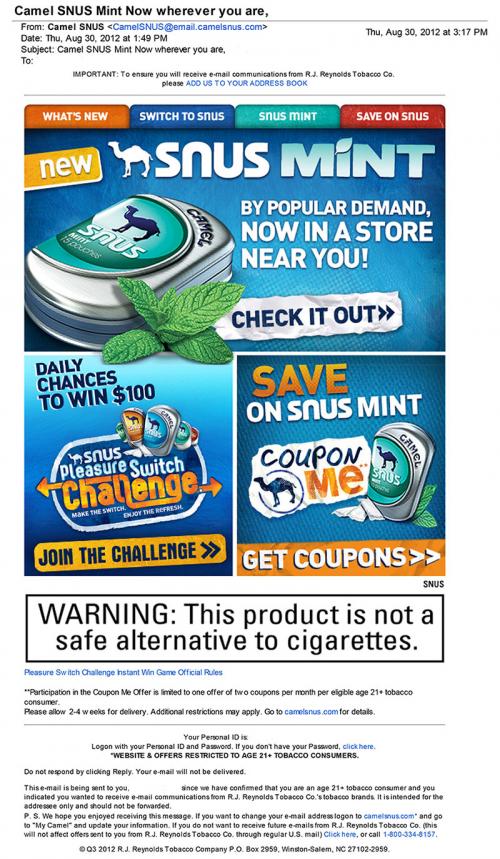 Email from Camel Snus sent in August 2012, announcing that the newest flavor, mint, is now available at nearby locations. The email also directs the receiver to the brand website for more information, to participate in the ongoing pleasure switch challenge and to redeem coupon offers.