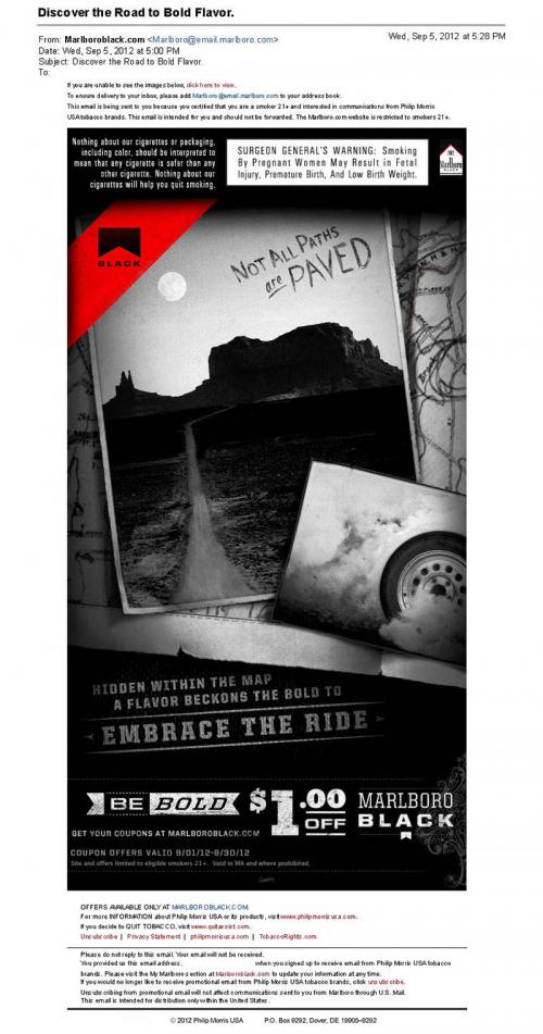 Email from Marlboro received in September 2012, promoting Marlboro Black. The email is mostly black and white, with an image of an empty road stretching ahead into mountains. Another image is of a tire kicking up dust. It also contains a coupon offer for $1.00 off a pack of Marlboro Black which can be redeemed online. Text: Not all paths are paved. Hidden within the map a flavor beckons the bold to embrace the ride.