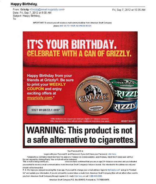 Email from Grizzly wishing the receiver a Happy Birthday and directing them to the website for weekly coupons. Text: It's your birthday. Celebrate with a can of Grizzly.