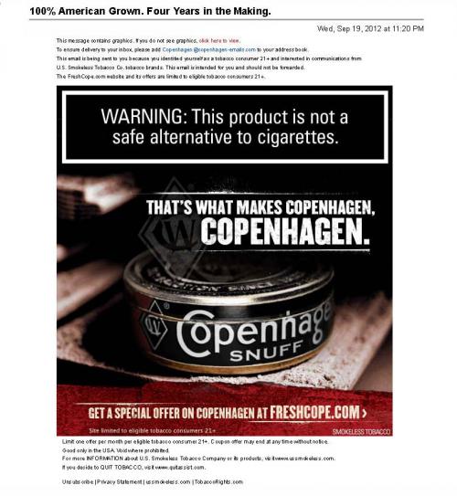 Email from Copenhagen received in September 2012 inviting the receiver to visit the brand website for a "special offer." Text: That's what makes Copenhagen, Copenhagen.