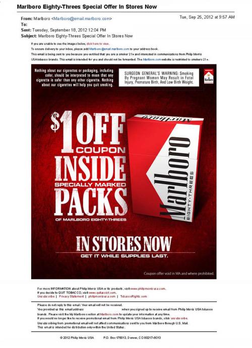 Email from Marlboro received in September 2012 inviting the receiver to visit the brand website for a $1 off coupon "Inside Specially Marked Packs of Marlboro Eighty-Threes."