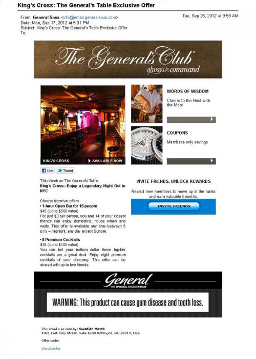 Email received from General Snus in September promoting the "General's Club." This is a promotional email featuring a "Words of Wisdom" section, coupons, and special offers from "The General's Table" including discounts for an open bar and cocktails. The email also invites the recipient to "invite friends" and "unlock rewards."