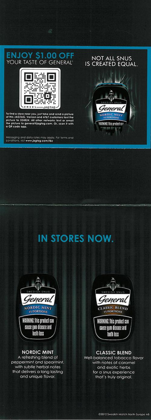 General Snus direct mail piece advertising it\'s \"Nordic Mint\" and \"Classic Blend\" flavors; the piece also includes a $1.00 off coupon.