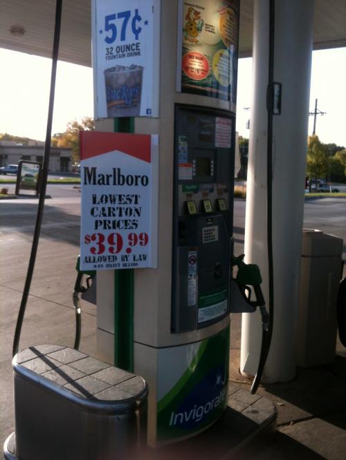 Image of an ad for cartons of Marlboro cigarettes taken at the point of sale at a BP gas station in Omaha, Nebraska. Photo taken in October 2012.