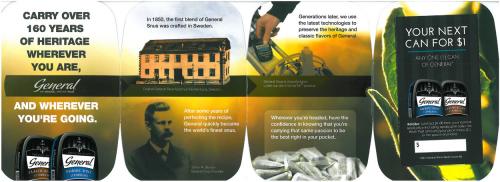 General Snus direct mail piece received in November 2012. Piece is shaped like a General Snus tin and contains information about the history of General Snus.