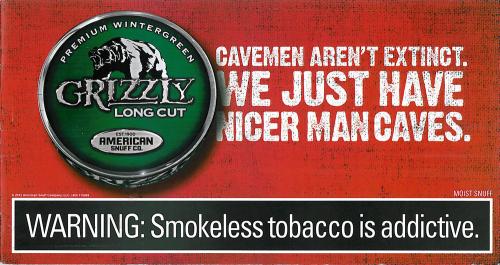 Grizzly direct mail piece received in November 2012. Piece promotes Grizzly\'s Man Cave Giveaway sweepstakes and includes coupons. Main text on the front \"Cavemen aren\'t extinct. We just have nicer man caves.\"