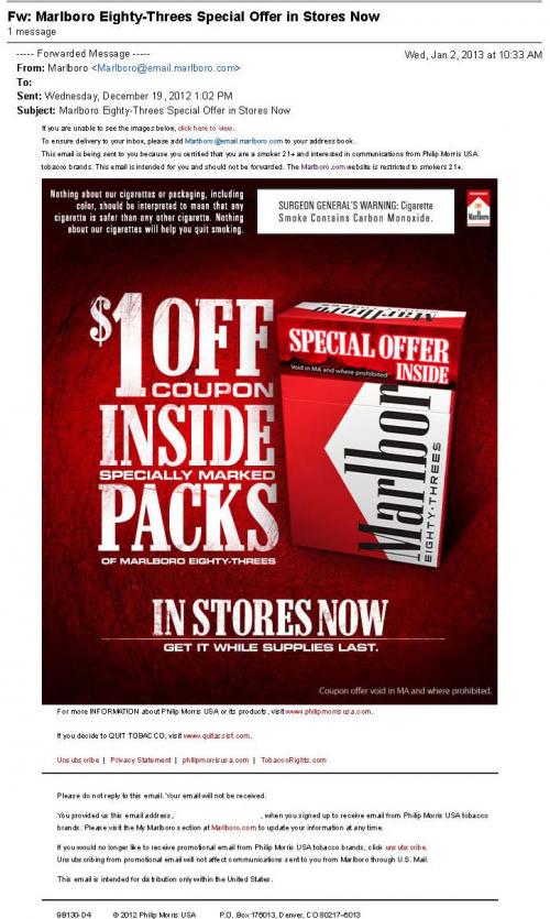 Email received from Marlboro in December 2012 promoting their Eighty-Three product and offering a coupon. Text: "$1 off coupon inside specially marked packs of Marlboro Eighty-Threes."