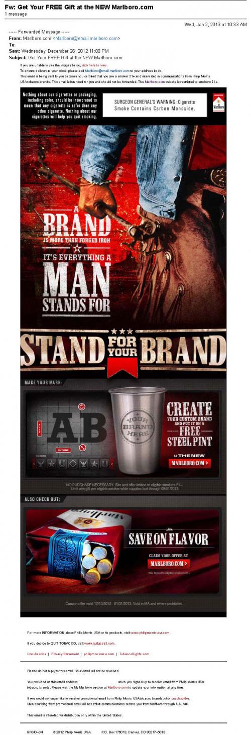 Email received by Marlboro in January 2013. Offering free steel pint at the new Marlboro website. The email also encourages the receiver to claim offers.