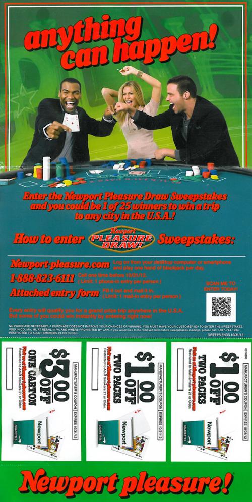 Direct mail piece from Newport received in August 2012 promoting their "Pleasure Draw" sweepstakes. The piece includes mail-in entry forms along with other information on how to enter. Coupons are also included. Text: "When the smooth taste of tobacco and menthol pleasure come together...anything can happen!"