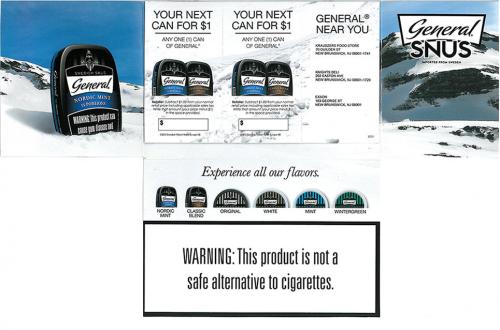 Direct Mail from General Snus received on December 2012 promoting their wide range of flavors. Provided coupons and list of stores near receiver.