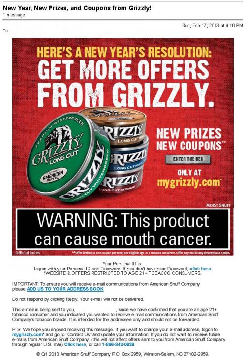 Email from Grizzly received in February 2013 informing the receiver of special offers, prizes, and coupons on Mygrizzly.com. Text: \"Here\'s a New Year\'s resolution: Get more offers from Grizzly.\"