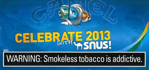 Direct mail piece received from Camel Snus in January 2013 inviting the receiver to Snusnation.com for two coupons every month and encouraging them to "Make a fresh start this New Year with Snus."