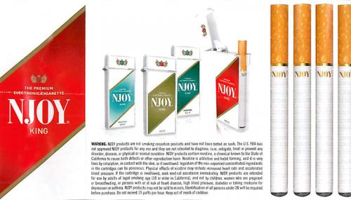 Multi-fold insert found in a pack of NJOY E-cigarettes. The insert provides information on the NJOY "King" electronic cigarette including available flavors, nicotine volume, and product features. It also encourages users to "tell their friends and family about the positive impact NJOY products are having on your life."