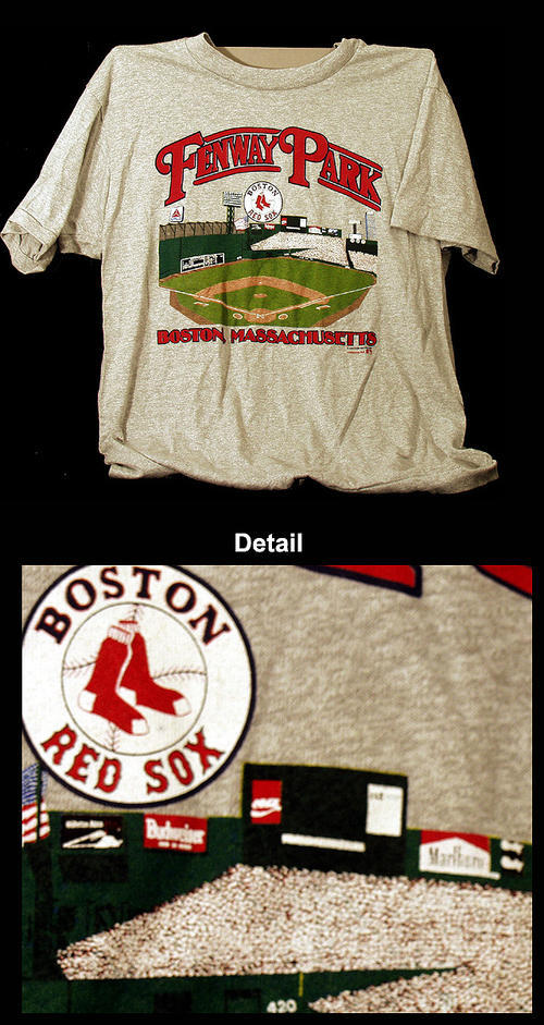 Gray t-shirt with design of Fenway Park, Boston, MA. Close up of home plate with Marlboro billboard.