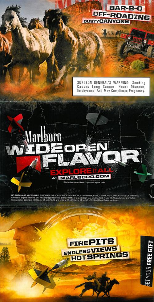 Direct mail piece received from Marlboro in March 2013 promoting their \\\\\\\"Wide Open Flavor\\\\\\\" sweepstakes, offering gifts, and delivering coupons. The piece is a multi-fold item with several sections referring to rugged, outdoorsy adventures and experiences. Text: \\\\\\\"Out here there\\\\\\\'s flavor around every turn.\\\\\\\"