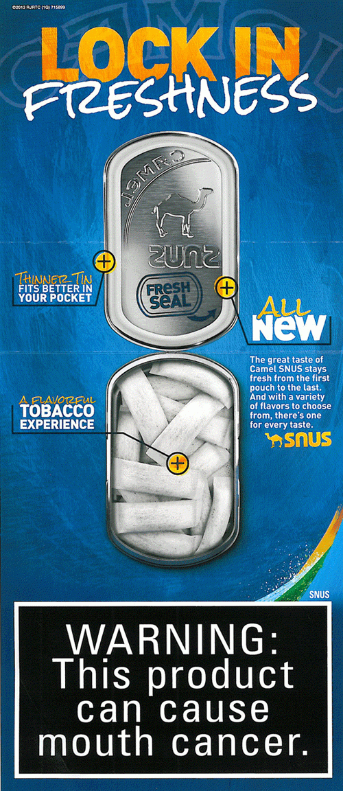 Direct mail piece received from Camel Snus in March 2013. The piece promotes their new storage tin with a pop-out feature and information on its design. It also invited the receiver to Snusnation.com and provides a coupon. Text: "Lock in Freshness."