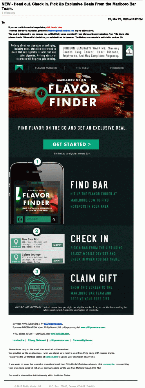 E-mail from Marlboro received in March 2013 promoting Marlboro Green's "Flavor Finder." Smokers can find flavor on the go and get an exclusive deal by searching the flavor finder for a local hot spot, checking in, and claiming a gift.