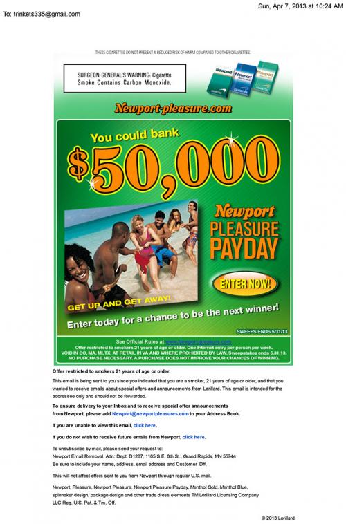 Newport Email received in April 2013 advertizing $50,000 sweepstakes.