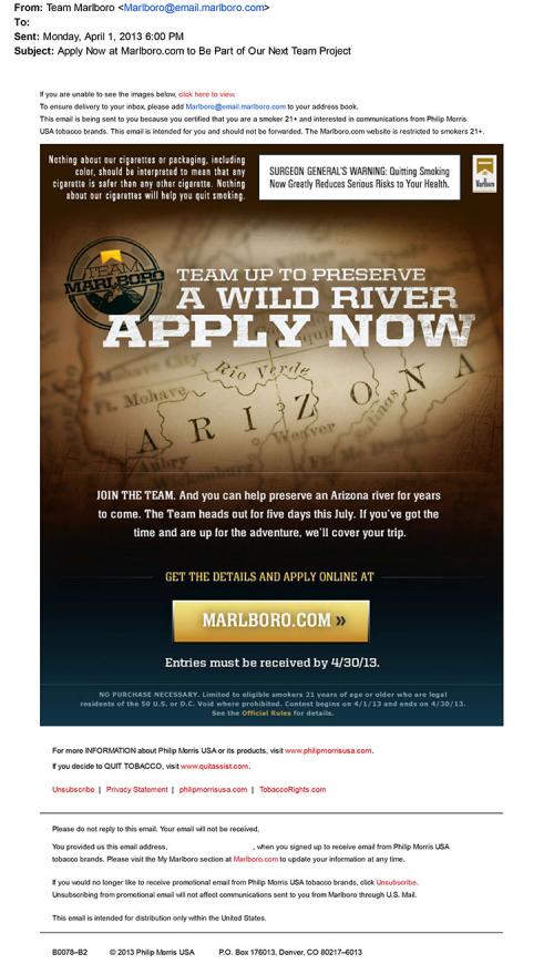 Marlboro email received in April 2013 promoting their New Team Marlboro initiative to preserve Arizona's rivers. Links to website for additional information.