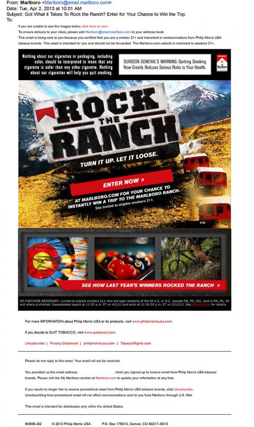 Marlboro email received in April 2013 promoting the Rock the Ranch Sweepstakes