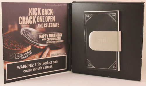 Direct mail piece from Copenhagen delivering a Birthday gift and coupons to the receiver. The coupons are folded and secured by the gift, which is a money clip, a dip can opener, and a bottle opener in one. The Directions are also included on how to use the gift. Text: "Kick back, crack open, and celebrate. Happy Birthday from Copenhagen."