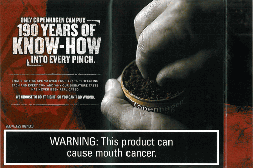 Multi-fold direct mail piece received from Copenhagen in April 2013. The piece first folds out into a picture of someone taking a pinch from a Copenhagen can and a heritage message beside it (note: this section has a rough, sandpaper-like feel to it). It then folds out to a larger display of a vintage Copenhagen tobacco jar and can with coupons attached next to it. Text: "Only Copenhagen can put 190 years of know-how into every pinch."